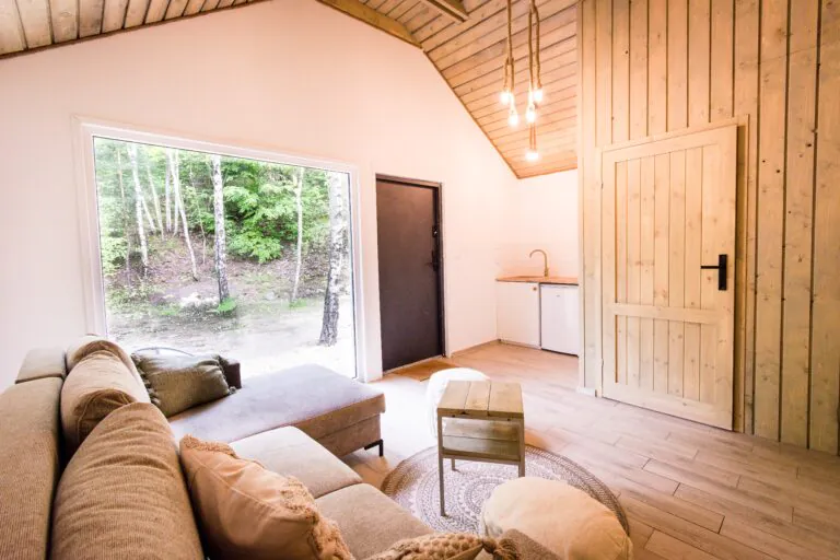 - Przestronne domki 4-osobowe (2 sypialnie 2-osobowe + salon z aneksem kuchennym)